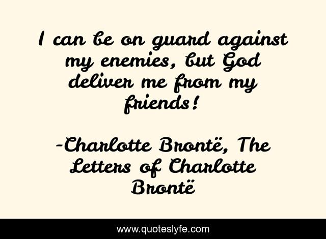 This page presents the quote "I can be on guard against my enemies, but God deliver me from my friends!". Author of this quote is Charlotte Brontë, The Letters of Charlotte Brontë. This quote is about friends, enemies,.