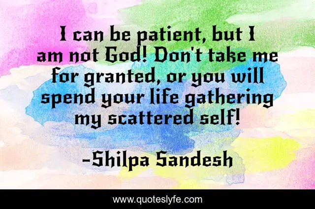 This page presents the quote "I can be patient, but I am not God! Don't take me for granted, or you will spend your life gathering my scattered self!". Author of this quote is Shilpa Sandesh. This quote is about patience, relationship,.