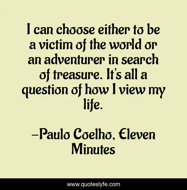 This page presents the quote "I can choose either to be a victim of the world or an adventurer in search of treasure. It's all a question of how I view my life.". Author of this quote is Paulo Coelho, Eleven Minutes. .