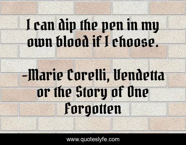 This page presents the quote "I can dip the pen in my own blood if I choose.". Author of this quote is Marie Corelli, Vendetta or the Story of One Forgotten. This quote is about blood, vendetta,.