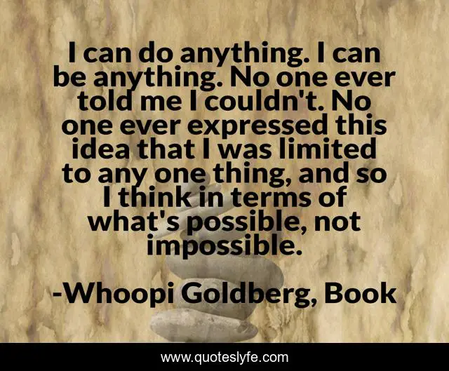 This page presents the quote "I can do anything. I can be anything. No one ever told me I couldn't. No one ever expressed this idea that I was limited to any one thing, and so I think in terms of what's possible, not impossible.". Author of this quote is Whoopi Goldberg, Book. This quote is about becoming-anything, confidence, possibilities, dreams-come-true, inspirational, enthusiasm, doing-anything, dreams,.