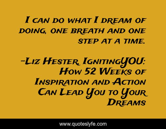 This page presents the quote "I can do what I dream of doing, one breath and one step at a time.". Author of this quote is Liz Hester, IgnitingYOU: How 52 Weeks of Inspiration and Action Can Lead You to Your Dreams. This quote is about success-action, success, famous, liz-hester, mary-morrissey, life-s-new-game, vision-building, personal-development, inspiration,.