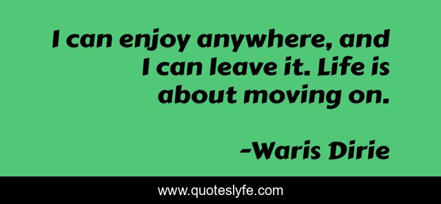 This page presents the quote "I can enjoy anywhere, and I can leave it. Life is about moving on.". Author of this quote is Waris Dirie. This quote is about enjoy, life, moving,.