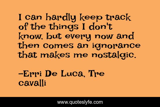 This page presents the quote "I can hardly keep track of the things I don't know, but every now and then comes an ignorance that makes me nostalgic.". Author of this quote is Erri De Luca, Tre cavalli. This quote is about knowledge-of-self, knowledge, nostalgia, smart, ignorance,.