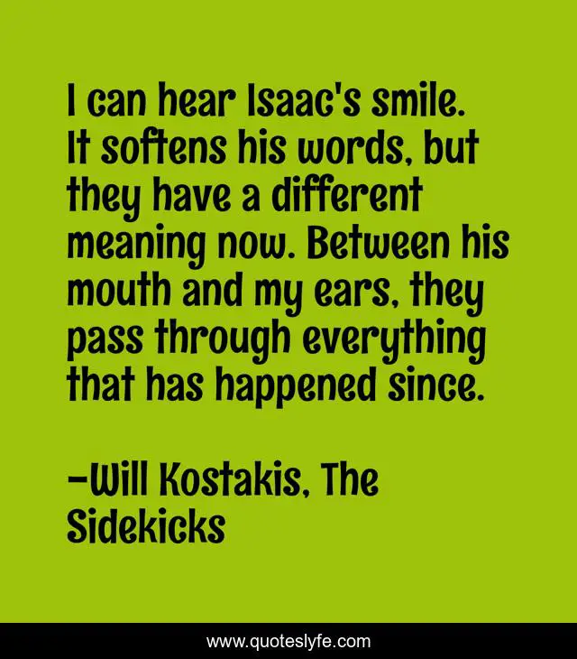 This page presents the quote "I can hear Isaac's smile. It softens his words, but they have a different meaning now. Between his mouth and my ears, they pass through everything that has happened since.". Author of this quote is Will Kostakis, The Sidekicks. .