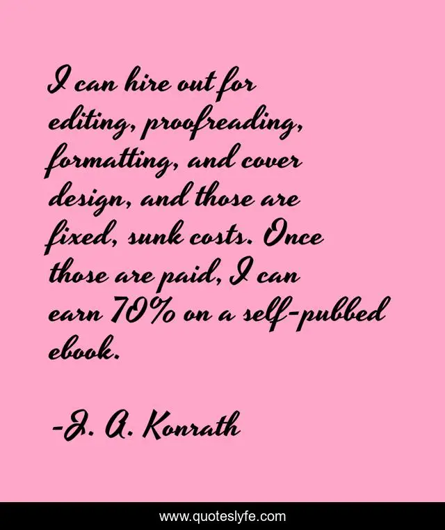 This page presents the quote "I can hire out for editing, proofreading, formatting, and cover design, and those are fixed, sunk costs. Once those are paid, I can earn 70% on a self-pubbed ebook.". Author of this quote is J. A. Konrath. This quote is about earn, editing, i can,.