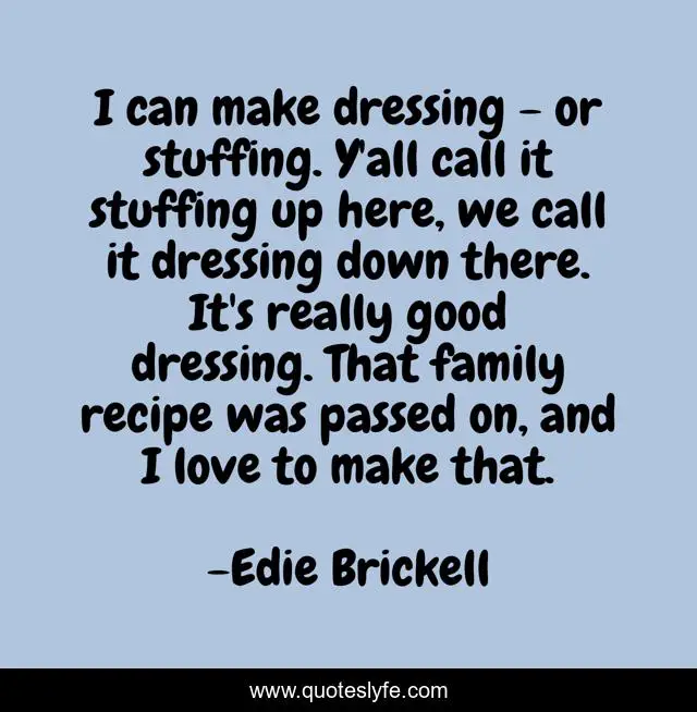 This page presents the quote "I can make dressing - or stuffing. Y'all call it stuffing up here, we call it dressing down there. It's really good dressing. That family recipe was passed on, and I love to make that.". Author of this quote is Edie Brickell. This quote is about good, love, family, affection,.