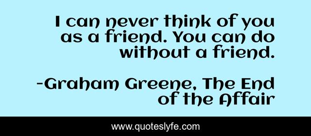This page presents the quote "I can never think of you as a friend. You can do without a friend.". Author of this quote is Graham Greene, The End of the Affair. This quote is about desire, friendship, heartbreak, love, affection,.