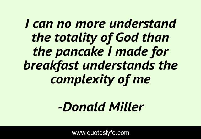 This page presents the quote "I can no more understand the totality of God than the pancake I made for breakfast understands the complexity of me". Author of this quote is Donald Miller. This quote is about god, donald-miller, blue-like-jazz,.
