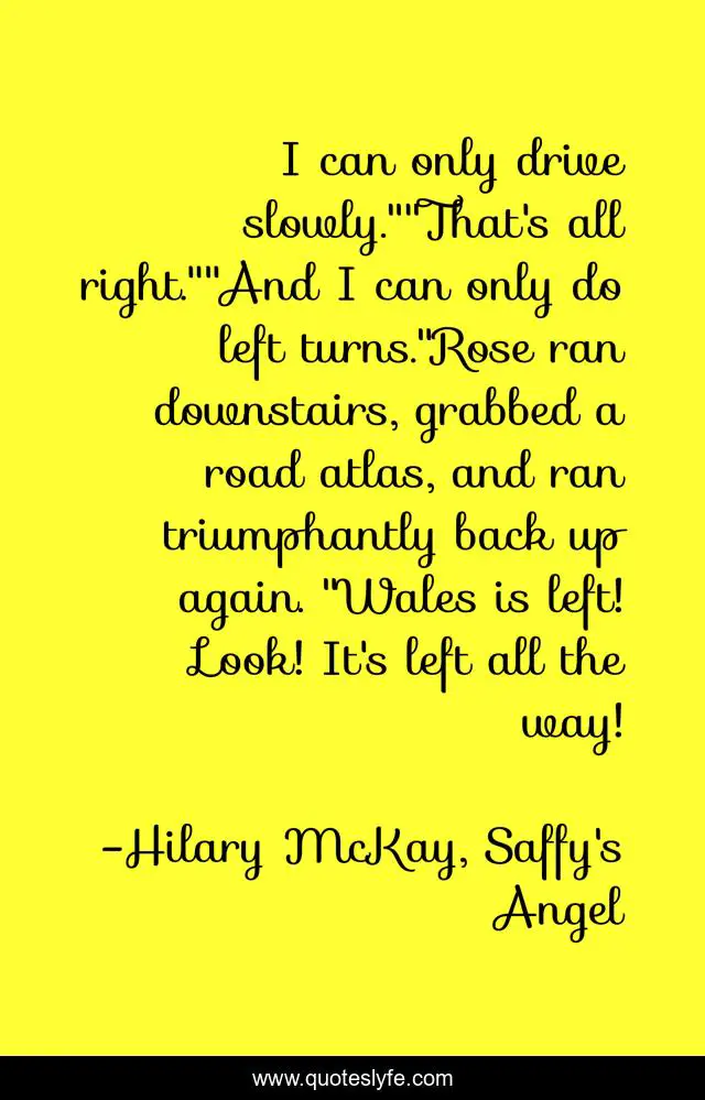 This page presents the quote "I can only drive slowly.""That's all right.""And I can only do left turns."Rose ran downstairs, grabbed a road atlas, and ran triumphantly back up again. "Wales is left! Look! It's left all the way!". Author of this quote is Hilary McKay, Saffy's Angel. This quote is about funny, kids, driving, sisters, comedy, trip, left,.