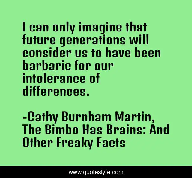 This page presents the quote "I can only imagine that future generations will consider us to have been barbaric for our intolerance of differences.". Author of this quote is Cathy Burnham Martin, The Bimbo Has Brains: And Other Freaky Facts. This quote is about intolerance, violence, differences, barbaric, racism, protest, future, politics, barbarism,.