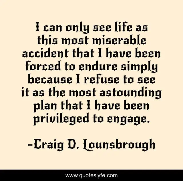 This page presents the quote "I can only see life as this most miserable accident that I have been forced to endure simply because I refuse to see it as the most astounding plan that I have been privileged to engage.". Author of this quote is Craig D. Lounsbrough. This quote is about gratitude, life, accident, appreciation, astounding, appreciate, thanksgiving, thankful, plan,.