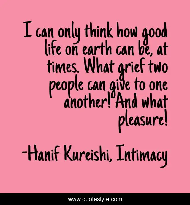 This page presents the quote "I can only think how good life on earth can be, at times. What grief two people can give to one another! And what pleasure!". Author of this quote is Hanif Kureishi, Intimacy. This quote is about relationships, hanif-kureishi, intimacy,.