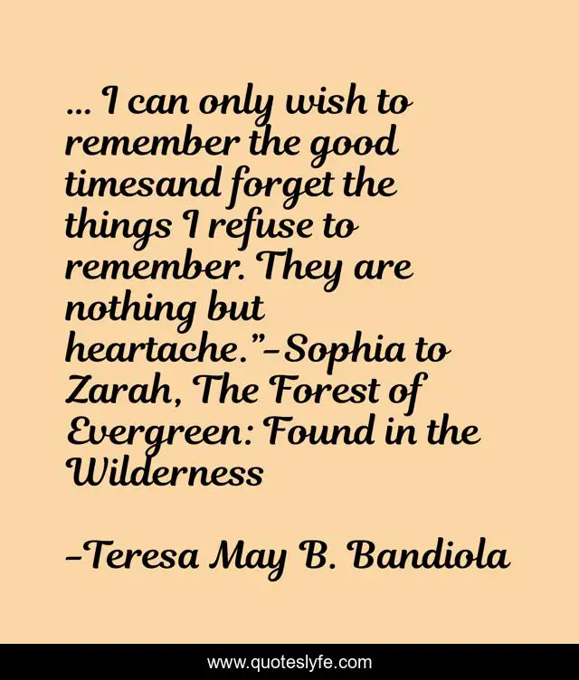 This page presents the quote "… I can only wish to remember the good timesand forget the things I refuse to remember. They are nothing but heartache.”-Sophia to Zarah, The Forest of Evergreen: Found in the Wilderness". Author of this quote is Teresa May B. Bandiola. This quote is about found, love-story, love, forest, affection,.