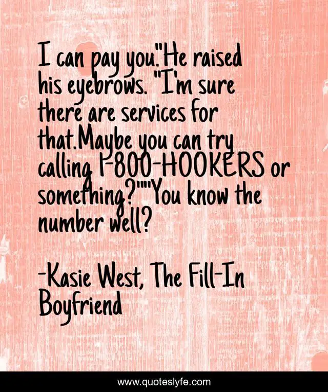 This page presents the quote "I can pay you."He raised his eyebrows. "I'm sure there are services for that.Maybe you can try calling 1-800-HOOKERS or something?""You know the number well?". Author of this quote is Kasie West, The Fill-In Boyfriend. This quote is about funny, banter, comedy, love, affection,.