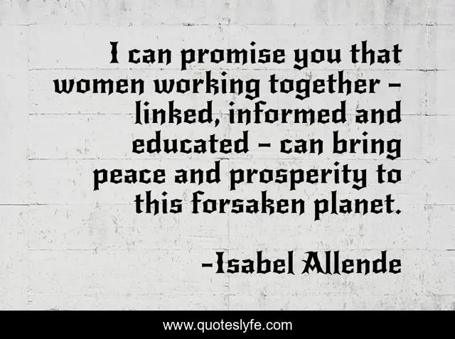 This page presents the quote "I can promise you that women working together – linked, informed and educated – can bring peace and prosperity to this forsaken planet.". Author of this quote is Isabel Allende. This quote is about prosperity, peace, ted-talks, solidarity, ted2007, education, feminism, women,.