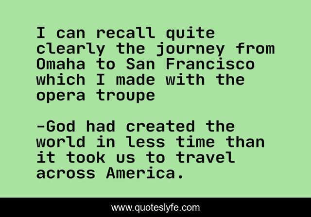 This page presents the quote "I can recall quite clearly the journey from Omaha to San Francisco which I made with the opera troupe". Author of this quote is God had created the world in less time than it took us to travel across America.. This quote is about the last testament of oscar wilde, peter ackroyd,.