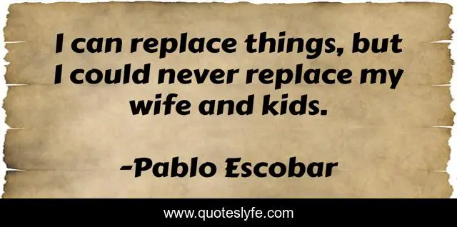 This page presents the quote "I can replace things, but I could never replace my wife and kids.". Author of this quote is Pablo Escobar. This quote is about family, drugs, real-world, drug-lord, inspirational, enthusiasm,.
