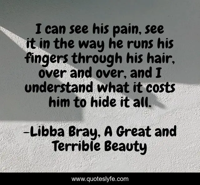 This page presents the quote "I can see his pain, see it in the way he runs his fingers through his hair, over and over, and I understand what it costs him to hide it all.". Author of this quote is Libba Bray, A Great and Terrible Beauty. .