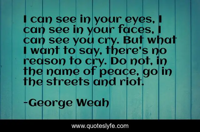 This page presents the quote "I can see in your eyes, I can see in your faces, I can see you cry. But what I want to say, there's no reason to cry. Do not, in the name of peace, go in the streets and riot.". Author of this quote is George Weah. This quote is about eyes, name,.