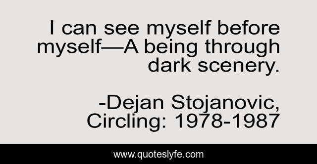 This page presents the quote "I can see myself before myself—A being through dark scenery.". Author of this quote is Dejan Stojanovic, Circling: 1978-1987. This quote is about scenery, myself, literature, being, dejan-stojanovic, poetry, wisdom, dark, quotes,.