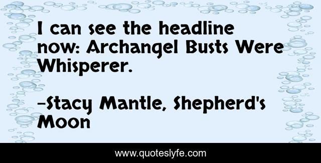 This page presents the quote "I can see the headline now: Archangel Busts Were Whisperer.". Author of this quote is Stacy Mantle, Shepherd's Moon. This quote is about archangel, fantasy, urban-fantasy, nephilim, werewolves, shapeshifters,.