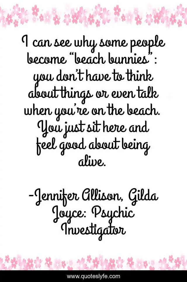 This page presents the quote "I can see why some people become “beach bunnies”: you don’t have to think about things or even talk when you’re on the beach. You just sit here and feel good about being alive.". Author of this quote is Jennifer Allison, Gilda Joyce: Psychic Investigator. This quote is about good, feel, alive, beach-bunnies, beach, think, talk,.
