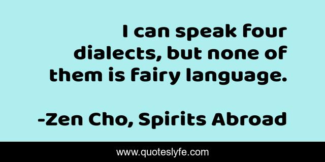 This page presents the quote "I can speak four dialects, but none of them is fairy language.". Author of this quote is Zen Cho, Spirits Abroad. This quote is about spirits, myth, malaysia, supernatural, ghosts, legend,.