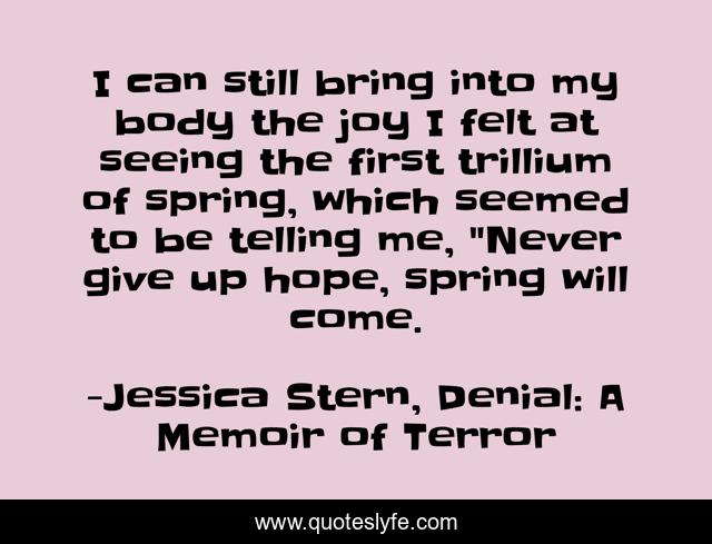 This page presents the quote "I can still bring into my body the joy I felt at seeing the first trillium of spring, which seemed to be telling me, "Never give up hope, spring will come.". Author of this quote is Jessica Stern, Denial: A Memoir of Terror. This quote is about spring, hope,.