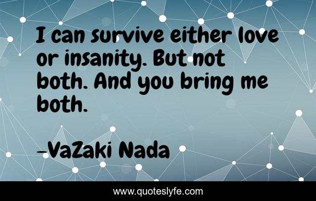 This page presents the quote "I can survive either love or insanity. But not both. And you bring me both.". Author of this quote is VaZaki Nada. This quote is about love, survival, madness, affection, insanity,.