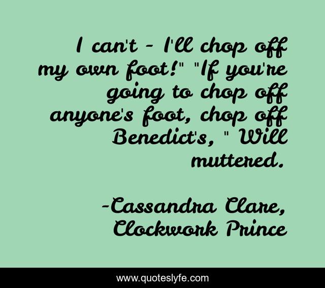 This page presents the quote "I can't - I'll chop off my own foot!" "If you're going to chop off anyone's foot, chop off Benedict's, " Will muttered.". Author of this quote is Cassandra Clare, Clockwork Prince. This quote is about will-herondale, clockwork-prince, tessa-gray, tessa,.