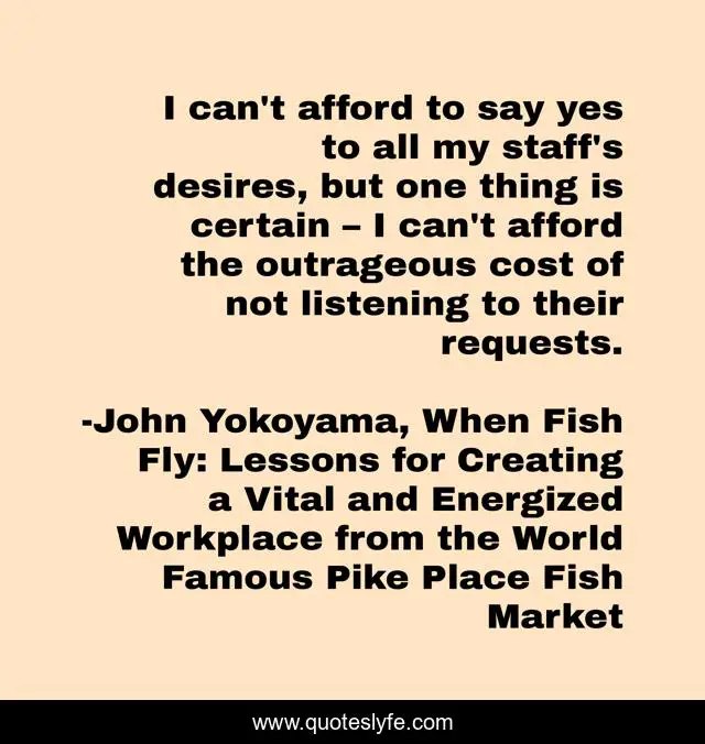 This page presents the quote "I can't afford to say yes to all my staff's desires, but one thing is certain – I can't afford the outrageous cost of not listening to their requests.". Author of this quote is John Yokoyama, When Fish Fly: Lessons for Creating a Vital and Energized Workplace from the World Famous Pike Place Fish Market. This quote is about open-mindedness, listening,.