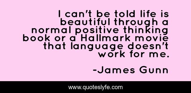 This page presents the quote "I can't be told life is beautiful through a normal positive thinking book or a Hallmark movie that language doesn't work for me.". Author of this quote is James Gunn. This quote is about beautiful, life, work,.