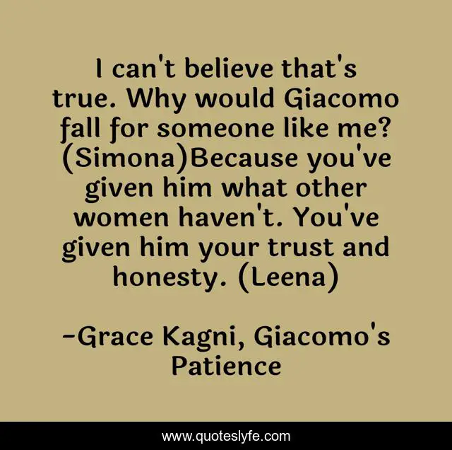 This page presents the quote "I can't believe that's true. Why would Giacomo fall for someone like me? (Simona)Because you've given him what other women haven't. You've given him your trust and honesty. (Leena)". Author of this quote is Grace Kagni, Giacomo's Patience. This quote is about romance, feeling, trust, love, affection,.