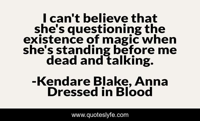 This page presents the quote "I can't believe that she's questioning the existence of magic when she's standing before me dead and talking.". Author of this quote is Kendare Blake, Anna Dressed in Blood. This quote is about horror, humor,.