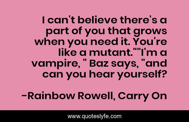 This page presents the quote "I can't believe there's a part of you that grows when you need it. You're like a mutant.""I'm a vampire, " Baz says, "and can you hear yourself?". Author of this quote is Rainbow Rowell, Carry On. This quote is about vampires, humour,.