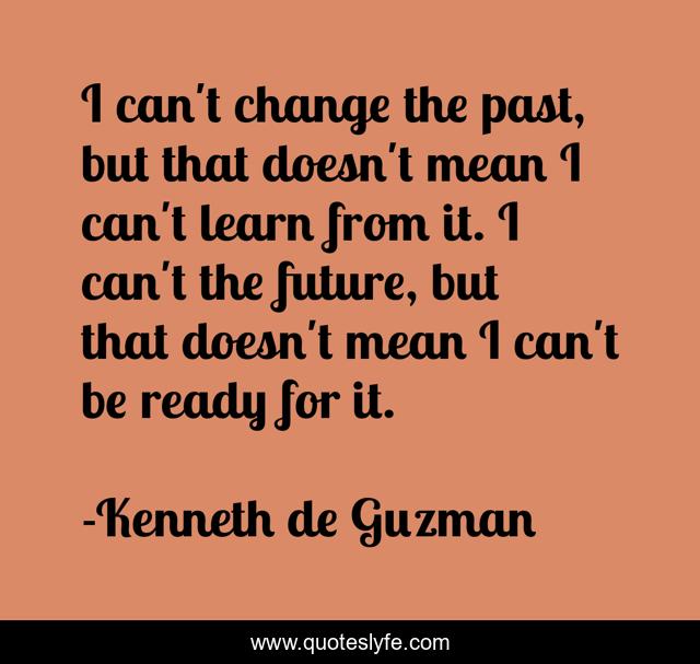 This page presents the quote "I can't change the past, but that doesn't mean I can't learn from it. I can't the future, but that doesn't mean I can't be ready for it.". Author of this quote is Kenneth de Guzman. This quote is about past, ready, future, prepare, learn,.