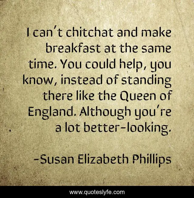 This page presents the quote "I can’t chitchat and make breakfast at the same time. You could help, you know, instead of standing there like the Queen of England. Although you’re a lot better-looking.". Author of this quote is Susan Elizabeth Phillips. This quote is about funny, comedy, humor,.