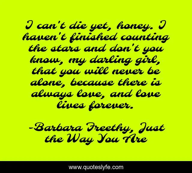 This page presents the quote "I can't die yet, honey. I haven't finished counting the stars and don't you know, my darling girl, that you will never be alone, because there is always love, and love lives forever.". Author of this quote is Barbara Freethy, Just the Way You Are. This quote is about love, optimistic, inspirational, enthusiasm, affection, astrology,.