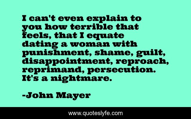 This page presents the quote "I can't even explain to you how terrible that feels, that I equate dating a woman with punishment, shame, guilt, disappointment, reproach, reprimand, persecution. It's a nightmare.". Author of this quote is John Mayer. This quote is about woman, guilt, disappointment,.