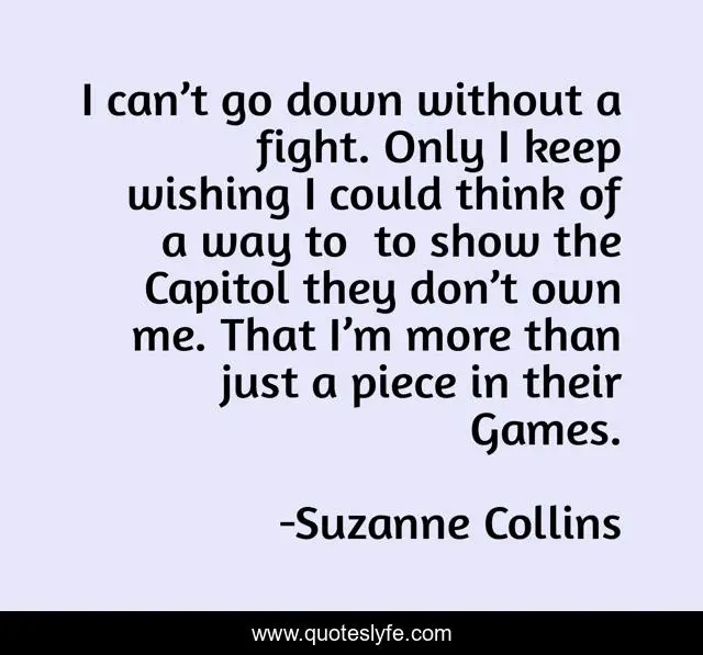 This page presents the quote "I can’t go down without a fight. Only I keep wishing I could think of a way to… to show the Capitol they don’t own me. That I’m more than just a piece in their Games.". Author of this quote is Suzanne Collins. This quote is about enthusiasm, decision, bravery, inspirational,.