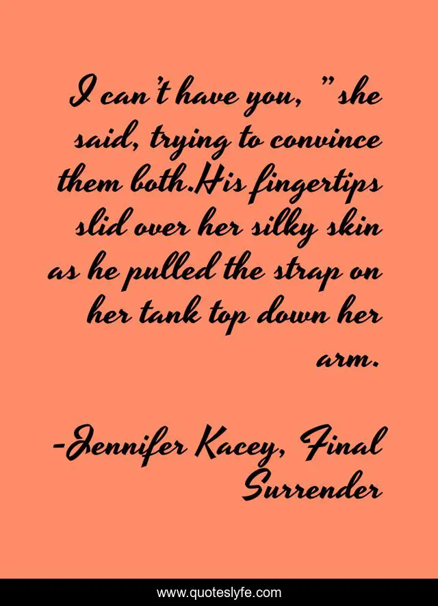 This page presents the quote "I can’t have you, ” she said, trying to convince them both.His fingertips slid over her silky skin as he pulled the strap on her tank top down her arm.". Author of this quote is Jennifer Kacey, Final Surrender. .