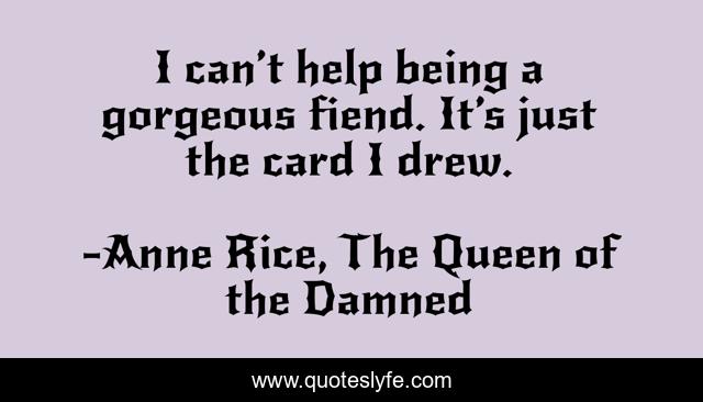This page presents the quote "I can’t help being a gorgeous fiend. It’s just the card I drew.". Author of this quote is Anne Rice, The Queen of the Damned. This quote is about lestat, vampires,.