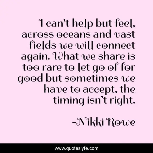 This page presents the quote "I can't help but feel, across oceans and vast fields we will connect again. What we share is too rare to let go of for good but sometimes we have to accept, the timing isn't right.". Author of this quote is Nikki Rowe. This quote is about believe, love, destiny, soul-mates, fate, connection, trust-the-timing, twin-flames, depth,.