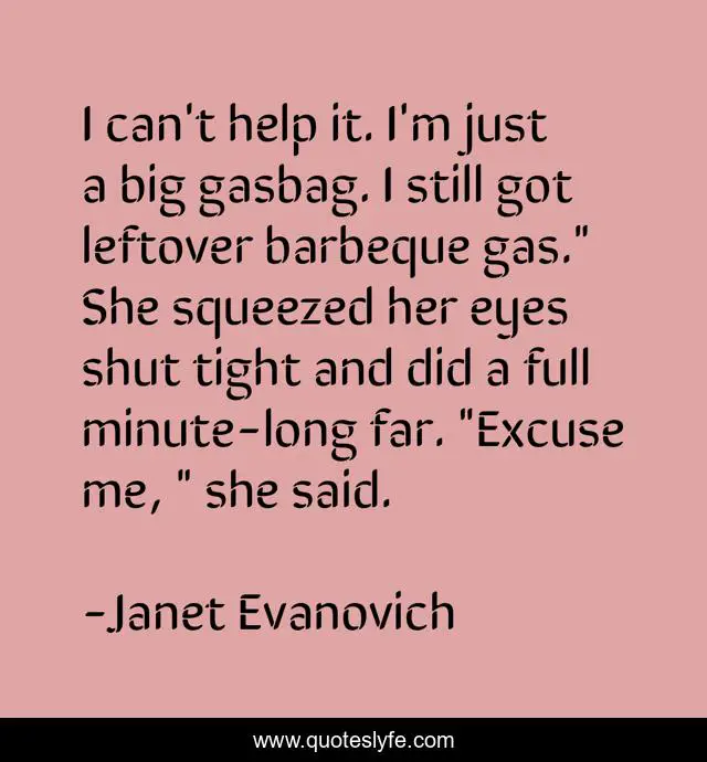 This page presents the quote "I can't help it. I'm just a big gasbag. I still got leftover barbeque gas." She squeezed her eyes shut tight and did a full minute-long far. "Excuse me, " she said.". Author of this quote is Janet Evanovich. .