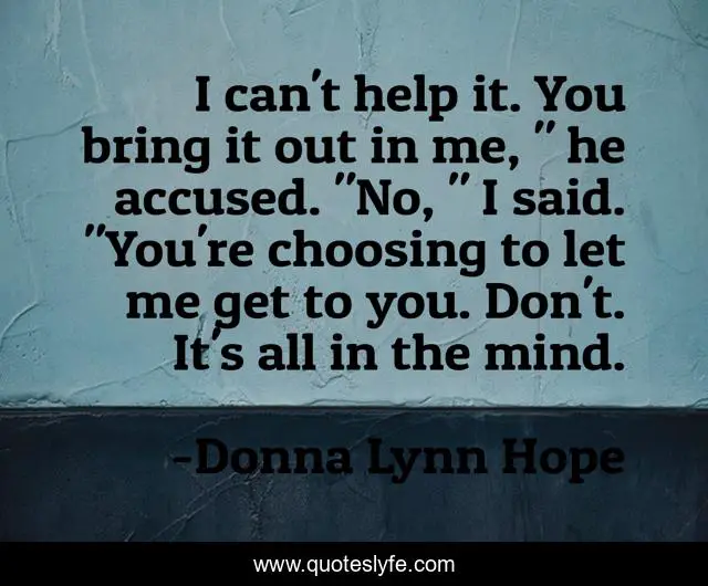 This page presents the quote "I can't help it. You bring it out in me, " he accused. "No, " I said. "You're choosing to let me get to you. Don't. It's all in the mind.". Author of this quote is Donna Lynn Hope. This quote is about control, relationships, mind, mind-games, emotions, feelings,.