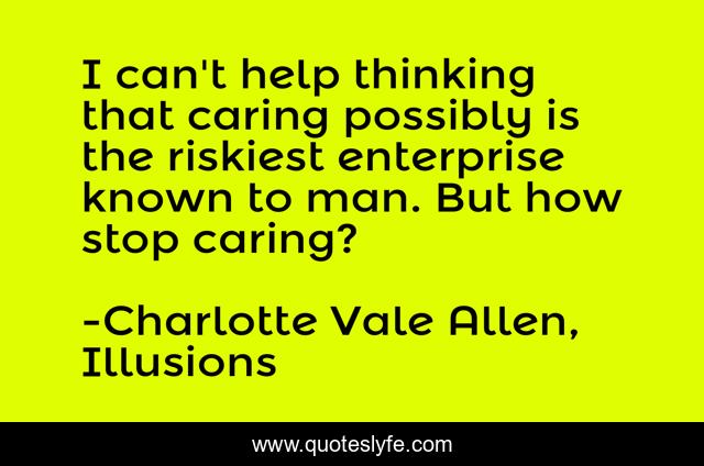 This page presents the quote "I can't help thinking that caring possibly is the riskiest enterprise known to man. But how stop caring?". Author of this quote is Charlotte Vale Allen, Illusions. .