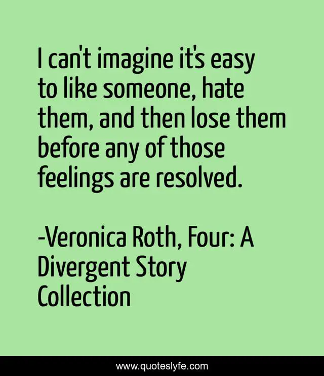 This page presents the quote "I can't imagine it's easy to like someone, hate them, and then lose them before any of those feelings are resolved.". Author of this quote is Veronica Roth, Four: A Divergent Story Collection. This quote is about life, death, love, inspirational, experience, feelings, book, books, risks,.