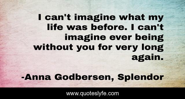 This page presents the quote "I can't imagine what my life was before. I can't imagine ever being without you for very long again.". Author of this quote is Anna Godbersen, Splendor. This quote is about alone, couple, love, affection,.