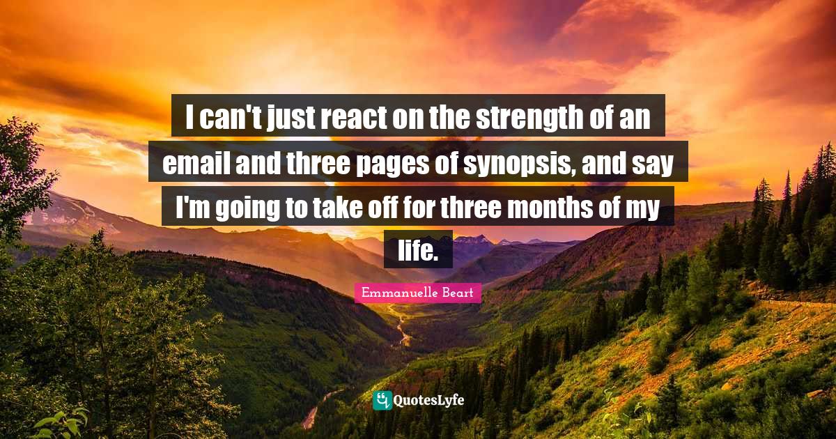 This page presents the quote "I can't just react on the strength of an email and three pages of synopsis, and say I'm going to take off for three months of my life.". Author of this quote is Emmanuelle Beart. This quote is about months, life, strength, three, email, pages, i can, synopsis,.